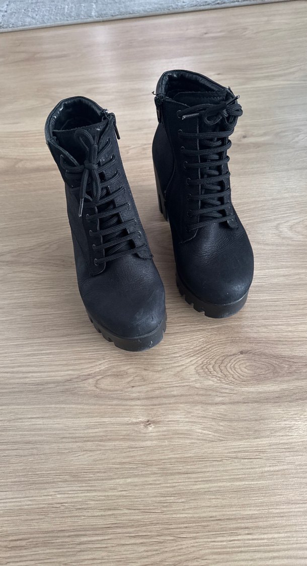 Siyah platform topuklu, bağcıklı kadın botu. Günlük kullanıma uygun, trend bir görünüm sunar. Nerden aldığımı hatırlamıyorum yazısı silinmiş deri ve yıpranmamış içi yumuşacık soğuk günlerde ayağınız üşümesin