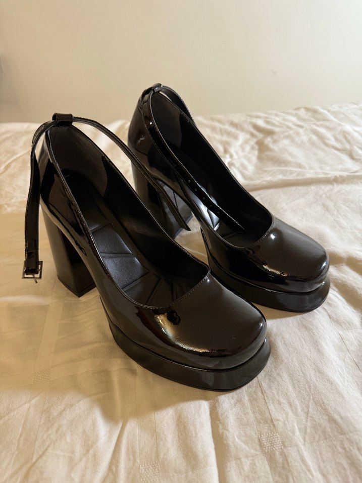 HİÇ GİYİLMEDİ. Siyah platform topuklu, tokalı kayışlı parlak yüzeye sahip gotik tarzda klasik zarafet sunan kadın ayakkabısı, ofis için uygundur.