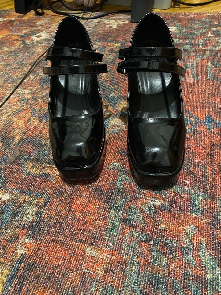 Siyah platform topuklu, çift kemerli parlak rugan ayakkabı. Önünde yakından bakınca görünen ufak çizikler var çok yakından bakınca anca görünüyor farklı bir sorunu yok