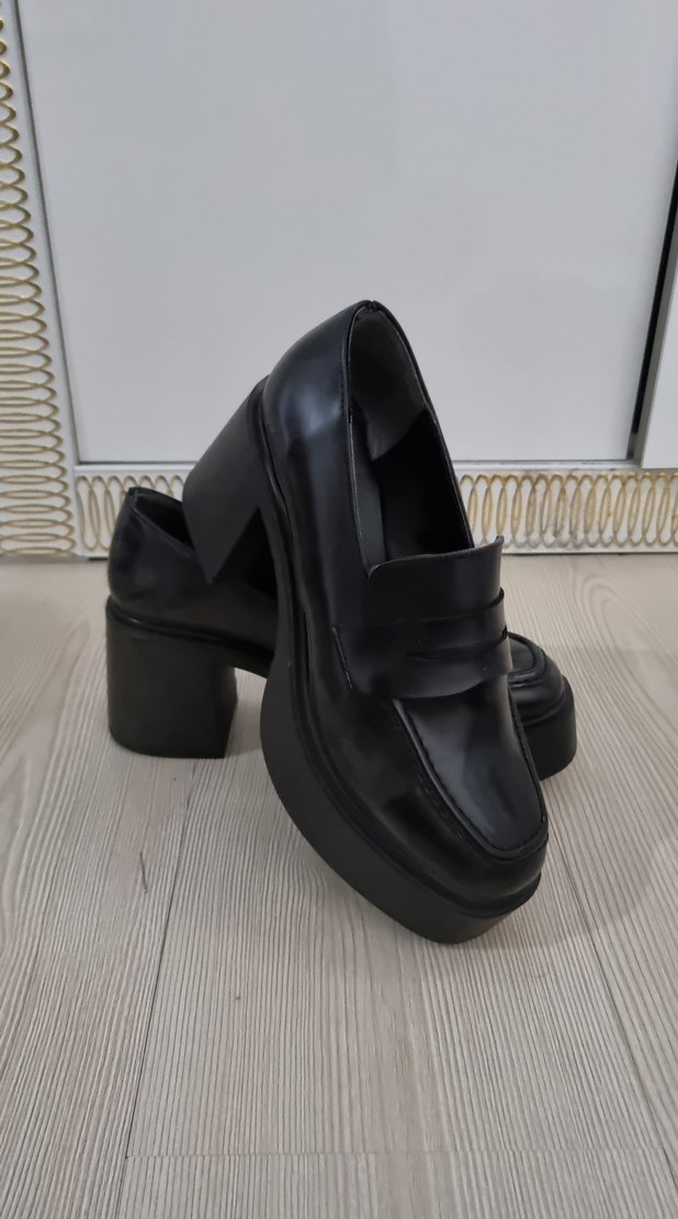 Siyah platform topuklu, toka detaylı, minimalist ve gotik tarzda kadın loafer, ofis kullanımı için uygun.