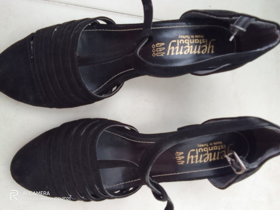 Siyah kadın sandaletler, platform kauçuk topuklu ve tokalı kayışlı, günlük kullanım için uygun koyu desenli tasarım .