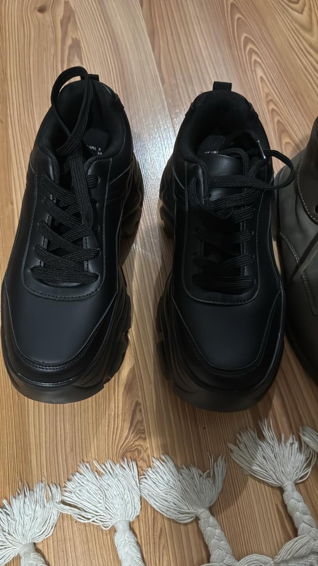Kadınlar için siyah, platform topuklu, bağcıklı kauçuk spor ayakkabı. Goth athleisure tarzına ve spor aktivitelerine uygun.