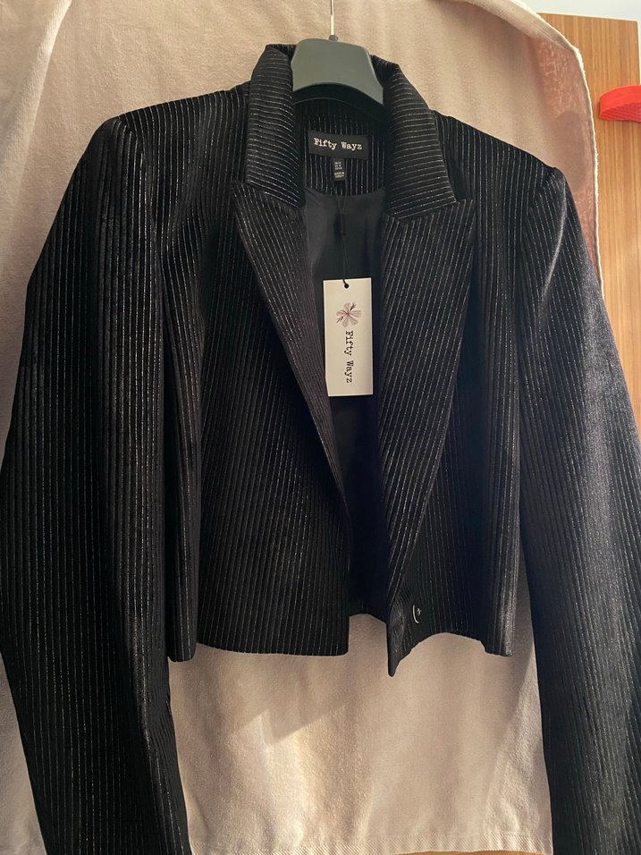 Kadın siyah, pliseli, oturmalı kesim blazer ceket. Notch yaka, uzun kollu ve midi boyda, ofis için uygun goth tarzında.