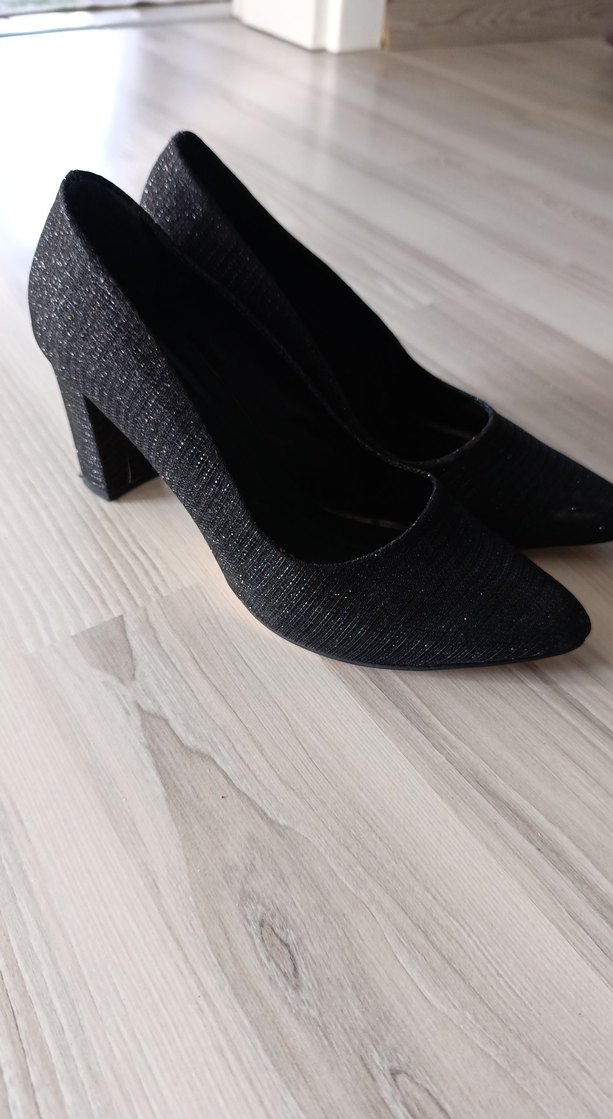 Kadın siyah stilettolar, kauçuk malzemeden, blok topuklu ve pliseli detaylıdır. Ofis kullanımı için çağdaş ve minimalist bir stil sunar.