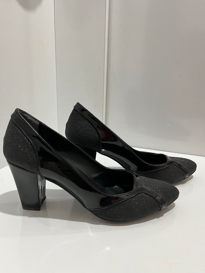 Siyah kadın stilettolar, blok topuklu ve pliseli detaylara sahip. Kauçuk malzemeden üretilmiş, modern klasik stile uygun ve ofis kullanımı için ideal. Desensiz ve şık tasarım.