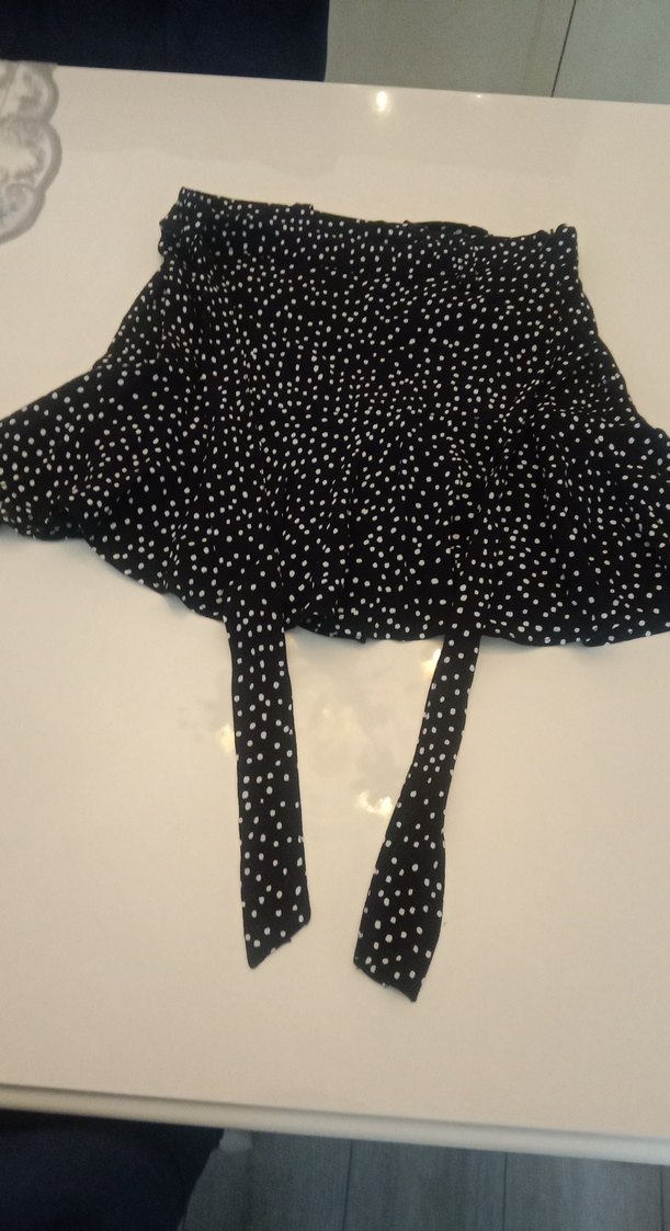 Siyah, beyaz puantiyeli, fırfırlı şortlu mini etek. Sentetik kumaştan, bohem ve retro tarzlar için uygun, günlük kullanıma uygun.