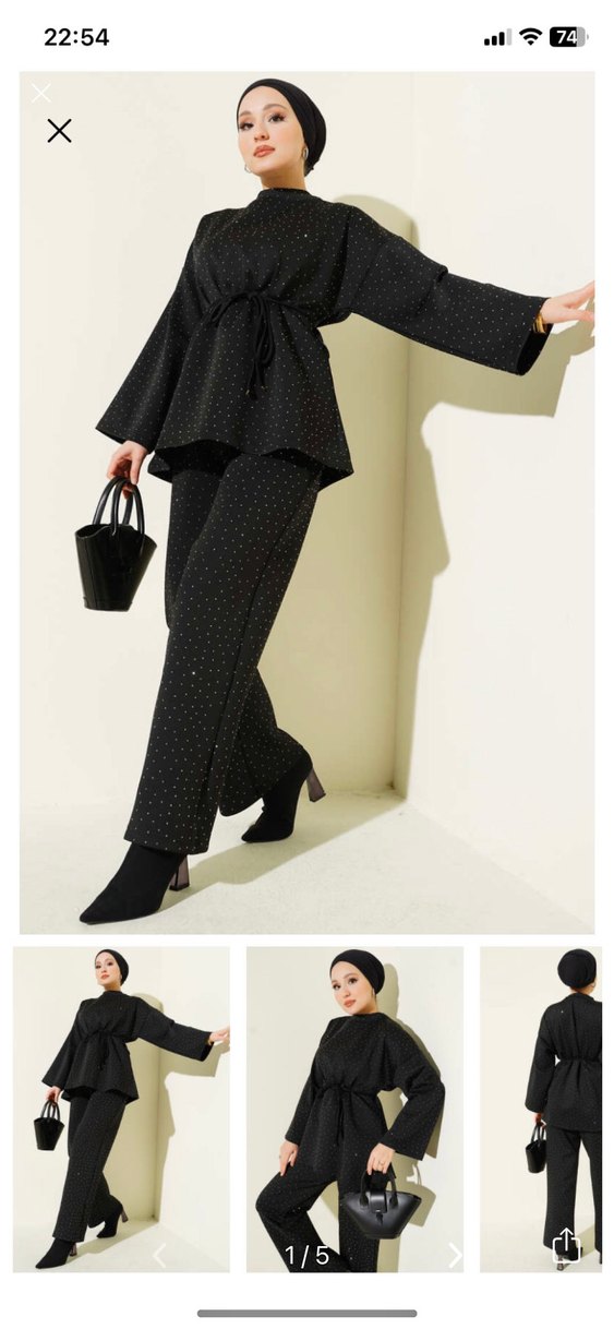 Siyah, puantiyeli kadın takımı, kemerli ve kesimli yaka detaylıdır. Uzun, askılı kolları ve midi boyu ile günlük kullanıma uygundur. Sıfır hiç kullanılmadı içinden 2 parmak daraltıldı sadece