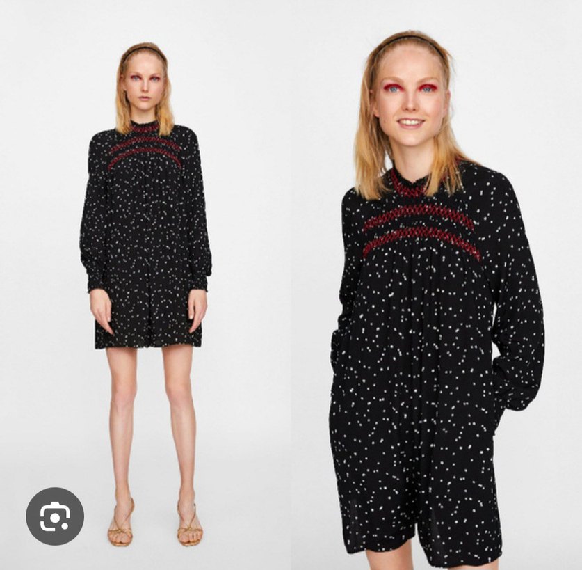 Siyah triko kumaştan, uzun kollu, yüksek yakalı, beyaz puantiyeli ve kırmızı örme detaylı, bol kesim kısa elbise, romantik akşamlar için uygun.