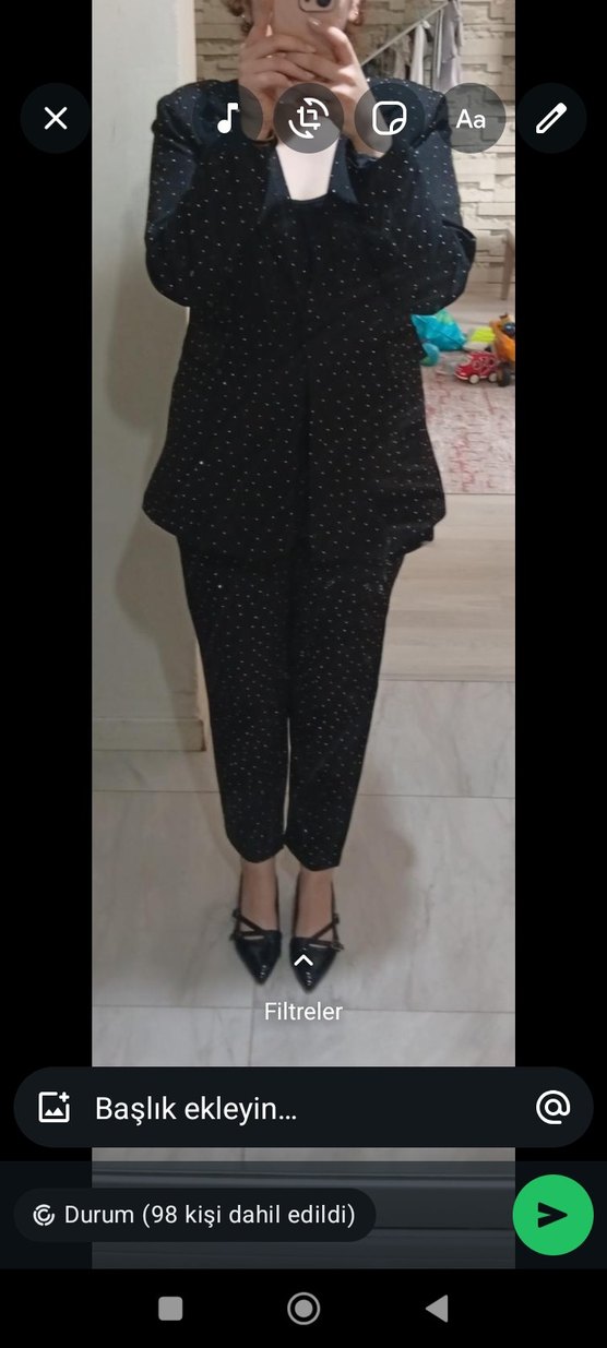 Siyah renkte, midi boyda ve normal kesim kadın kumaş pantolon. Payetli puantiyelerle süslenmiş, şık ve günlük kullanıma uygun. sıfır daha giyilmedi denendi sadece L bedene uygundur çok kaliteli içi astarlı ceketin taşlar zımbalı asla kopma çıkma yapmaz