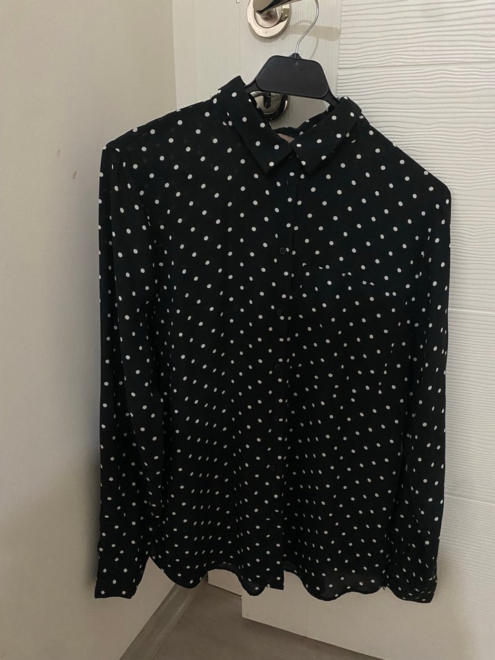Fitted kesim, uzun kollu, yakalı ve düğmeli bu kadın gömleği siyah zemin üzerine beyaz puantiyeli desene sahiptir. Yumuşak sentetik kumaştan üretilmiştir.