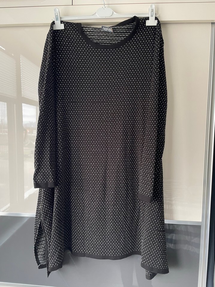 Siyah renkli, uzun kollu, yuvarlak yakalı, asimetrik bol kesim kadın triko tunik. Beyaz puantiyeli, örgü dokulu rahat stil sunar. Çok severek giydim. Çok sık bir kazak. İçine beyaz gömlekle dar paça ile süper oluyor. Al kaçırma