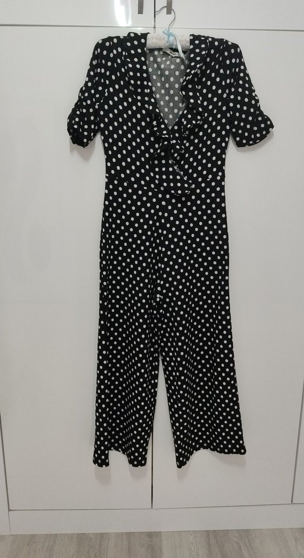 Kadınlar için siyah zemin üzerine beyaz puantiyeli, kısa kollu, V yakalı ve düğmeli uzun tulum. Günlük sokak stili için uygundur.