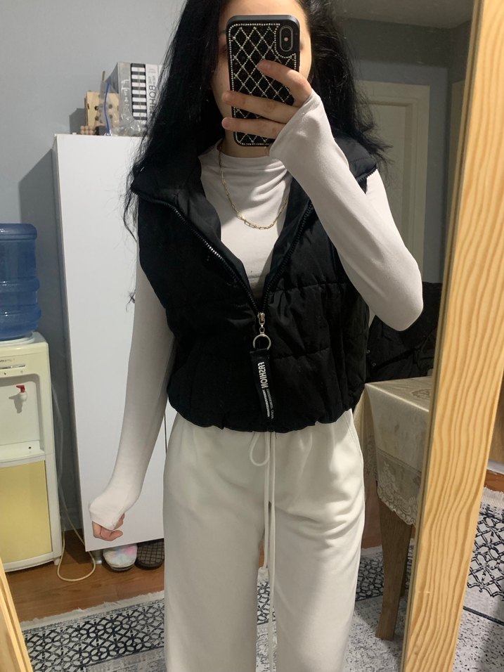 Kadınlar için yüksek yakalı, , pamuk kumaştan fitted siyah puff yelek. Midi boy ve kolsuz, gündelik sokak stili için uygun.
