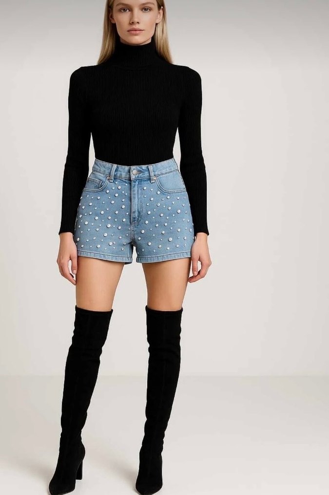 Kadınlar için siyah pul işlemeli puantiyeli, kısa ve dar kesim denim şort. Günlük rahatlık ve sokak stiline uygun. ✨