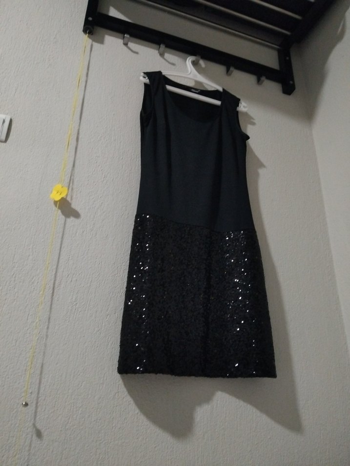 Siyah, kolsuz ve V yakalı silim kesim ve dökümlü tasarıma sahip.sadece bir kez giyildi Midi boyda ve yumuşak sentetik kumaştan üretilmişti üstünde düşük kol tülden pareosu var elbisenin boyu 92 cm iki koltuk altı arası 45 cm dir mağaza ürünüdür