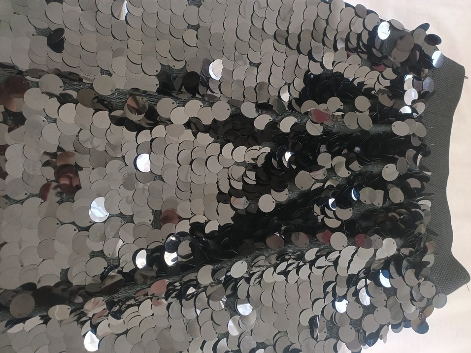 Dar kesim siyah mini etek, pul payetli sentetik kumaştan ve koyu yılan desenli, gotik ve avangart tarz için uygun.