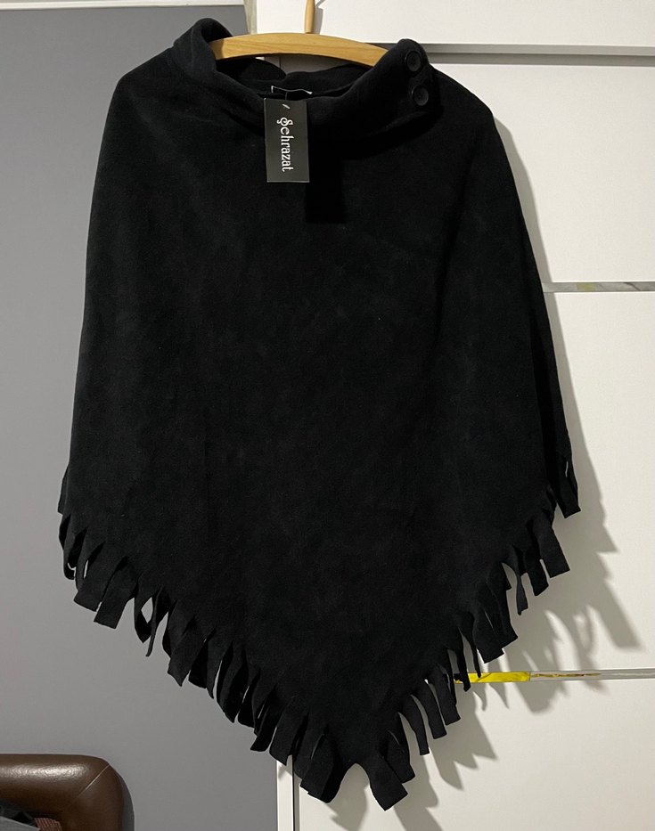 Yüksek yakalı, kolsuz, püsküllü kenarları olan, siyah, kadın ince polar panço. Rahat kesimi ve yumuşak, sıcak kumaşıyla dış mekan için uygundur.