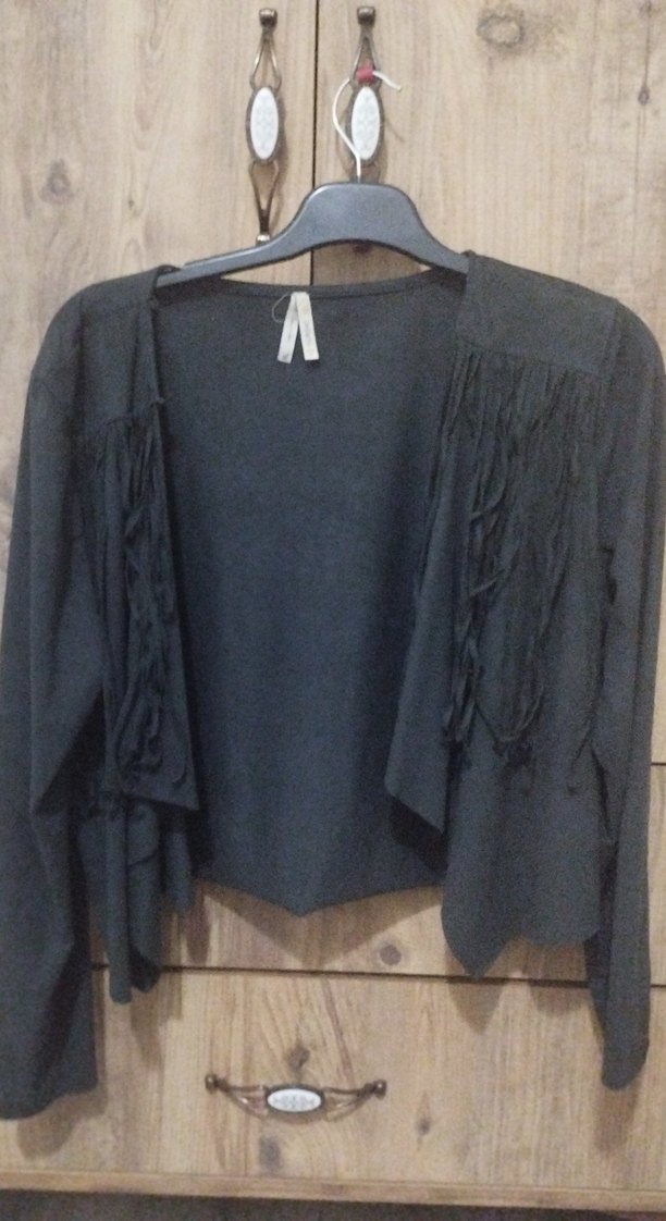 Kadınlar için uzun kollu, yuvarlak yakalı ve bol kesim süet ceket. Kısa boyda, püskül detaylı ve bohem tarzda, günlük kullanıma uygun gri-siyah tonlarda.