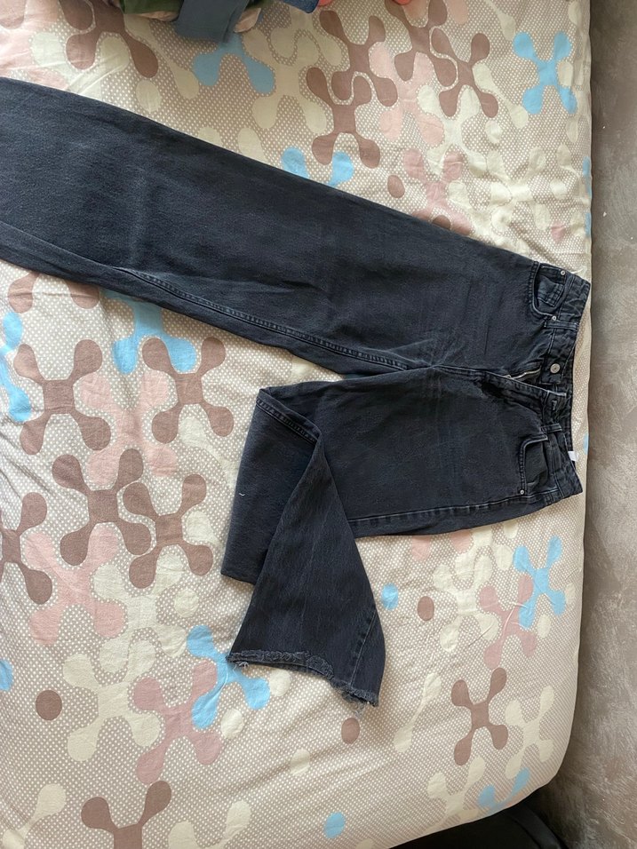 Bu kadın pantolonu normal boyda, rahat kesim koyu renkli denim kumaştan yapılmıştır. Günlük kullanıma uygundur.