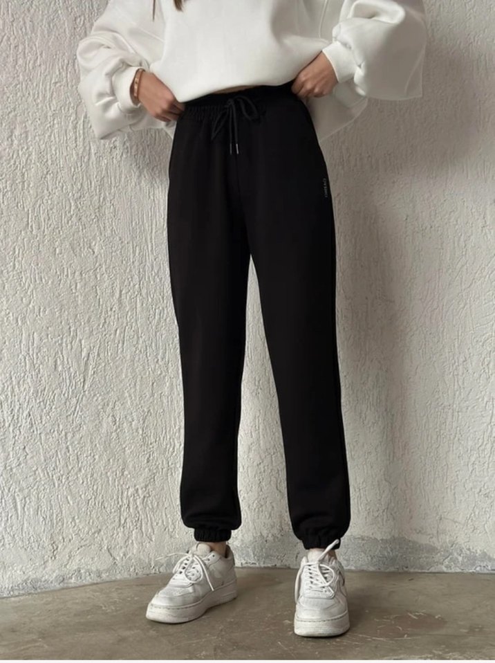 Kadınlar için rahat kesim ve normal boyda, yumuşak kumaştan siyah eşofman altı. Günlük kullanım için sade ve şık tasarım, lastikli paçalarla.