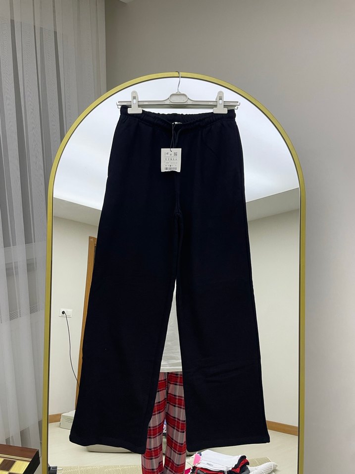 Yumuşak ve sıcak kumaştan yapılmış siyah, bol kesim kadın eşofman altı. Midi boy ve desensiz tasarımıyla günlük rahat kullanıma uygundur.