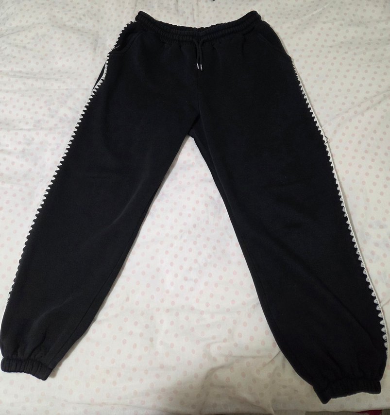 Siyah, rahat kesim ve yanları beyaz detaylı eşofman altı. Belinde bağcıklı, yumuşak ve sıcak kumaştan günlük kullanım için uygun.