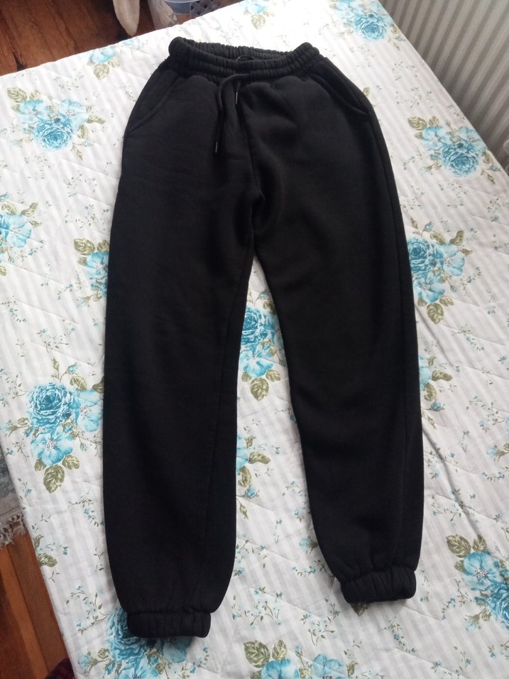 İçi yünlüdür sıcak tutuyor Siyah, rahat kesim, elastik bel ve paça manşetli, yumuşak ve sıcak kumaştan kadın eşofman altı. Günlük kullanıma uygun rahat sokak stili.