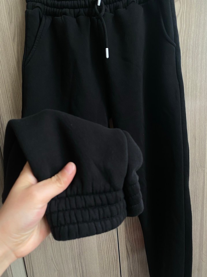 Siyah, rahat kesim ve normal boyda, fermuarlı cepli kadın eşofmanı. Yumuşak ve sıcak kumaştan, günlük rahat stil için uygundur. Hafif lekesi var onun dışında temiz etikette L beden mevcut ama kalıp dar S-M giyebilir