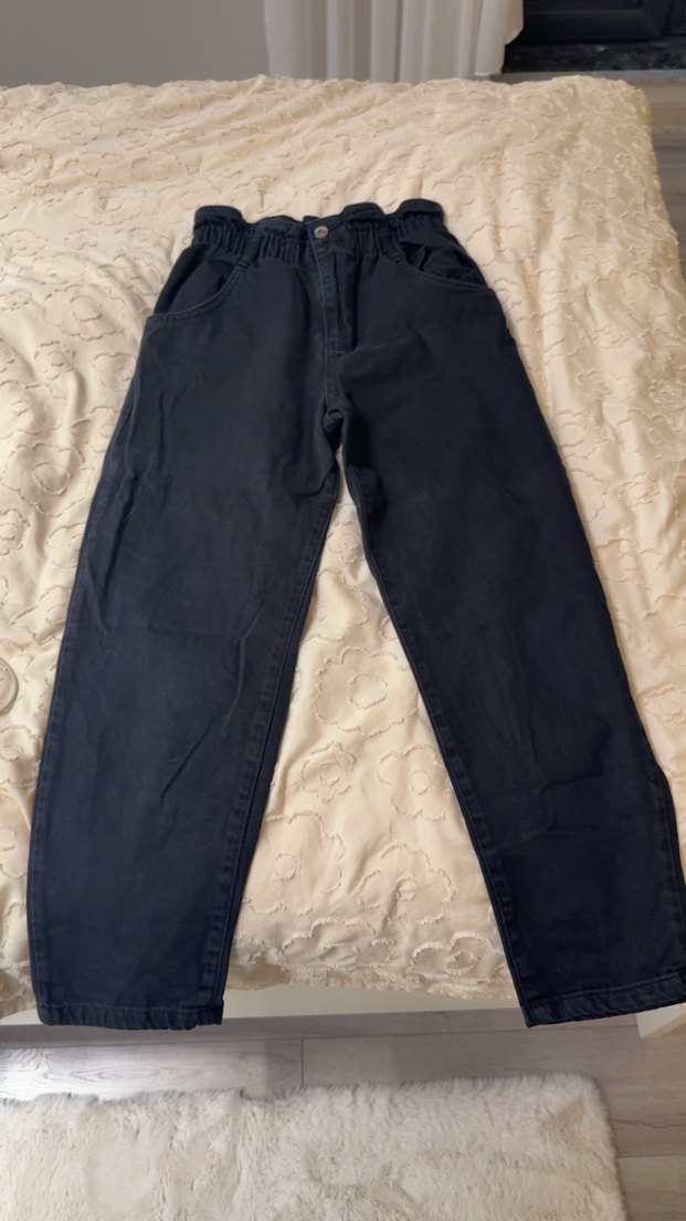 Kadın için siyah renkte, elastik bel bantlı, bol kesim kot pantolon. Havuç model. Rahat ve şık normcore tarzı için uygundur.