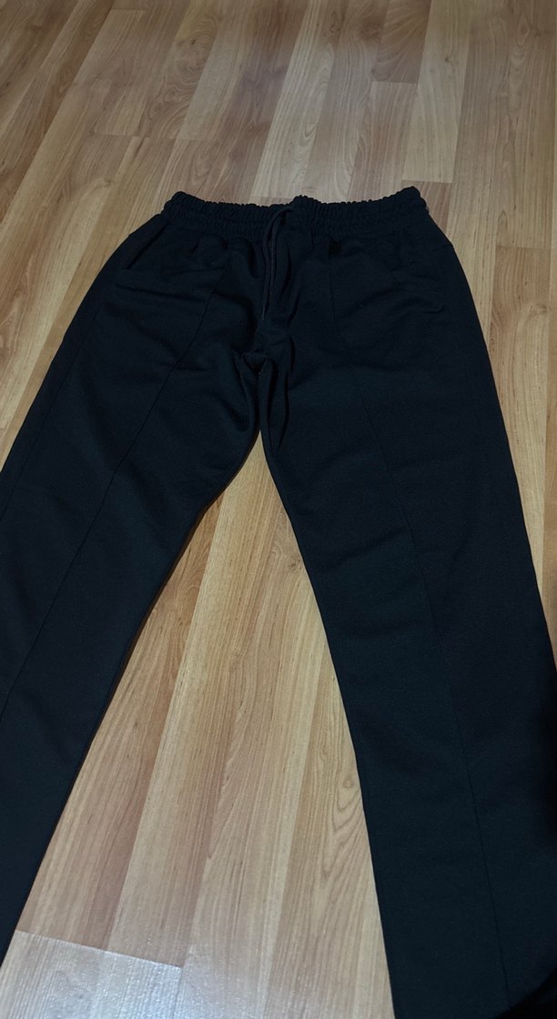 Kadın siyah kumaş pantolon, rahat kesim ve midi boyda, yumuşak sentetik kumaştan. Spor ve sokak stili için uygun, trend bir casual görünüm sağlar.