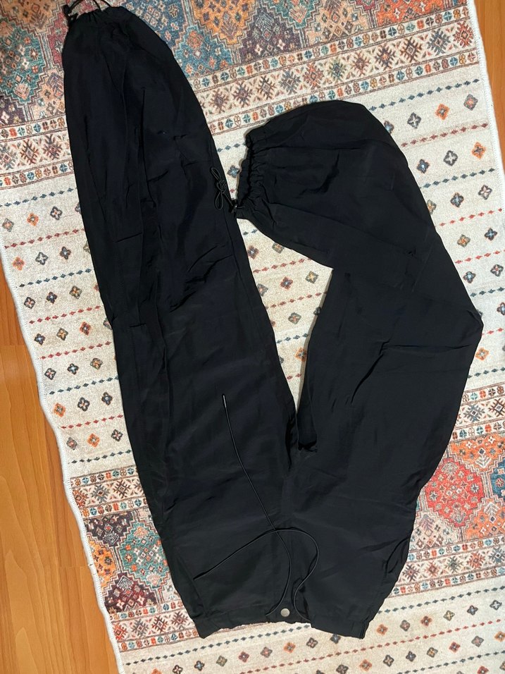 Siyah, bol kesim ve uzun boy kadın pantolon, yumuşak sentetik kumaştan, rahat ve şık sokak stili için uygundur.