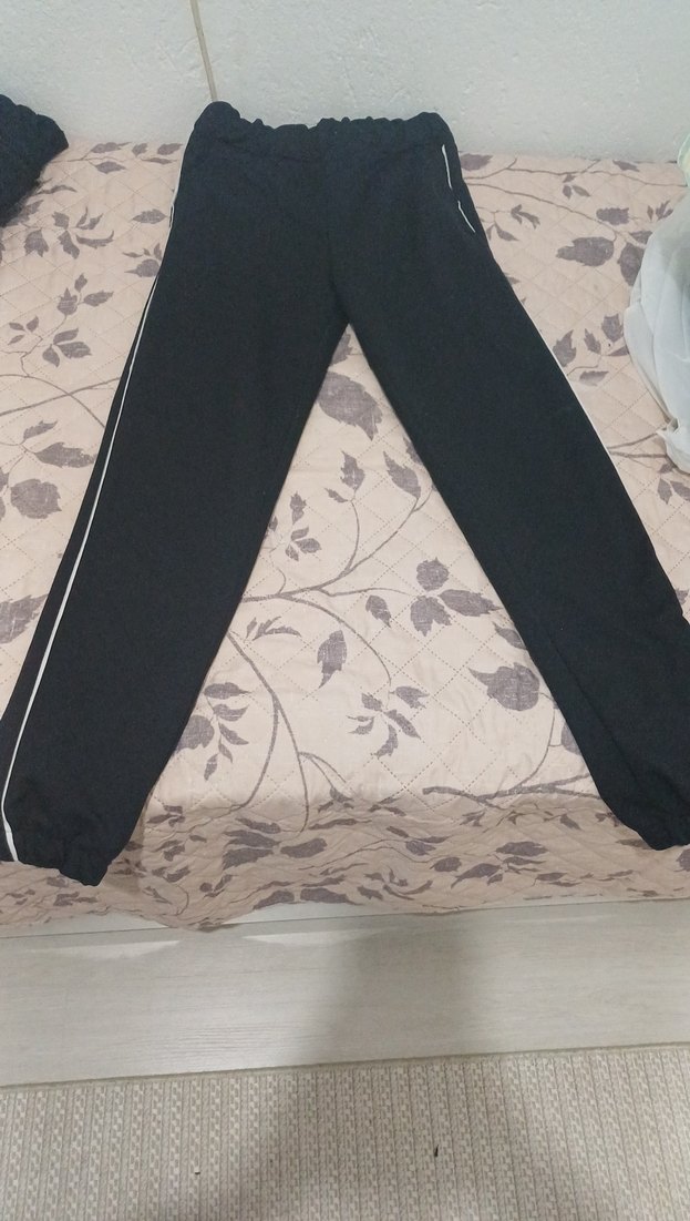 Kadınlar için elastik bel ve yan çizgili, rahat kesim siyah spor pantolon. Konforlu sentetik kumaştan, dış mekan kullanımı için uygundur. bel35.5 cm boy 99cm paça 10cm