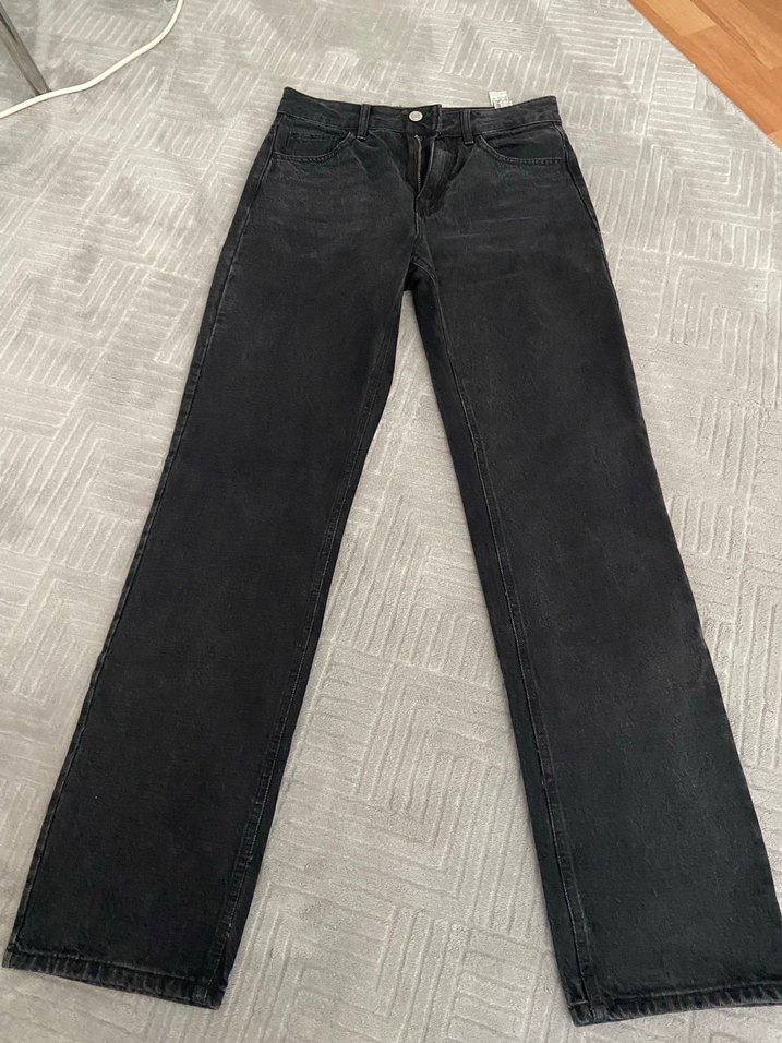 Kadınlar için siyah denimden yapılmış, regular fit ve normal boyda jean. Desensiz, günlük rahat ve şık sokak stiline uygun.