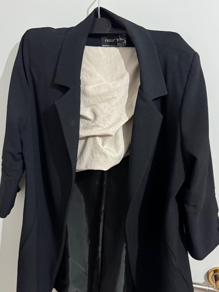 Kadın siyah keten blazer, notched lapel yaka ve uzun kollu. Regular fit ve midi boyda, drapeli detaylı, ofis ve günlük kullanım için uygundur. ic astarinda yirtik vardir