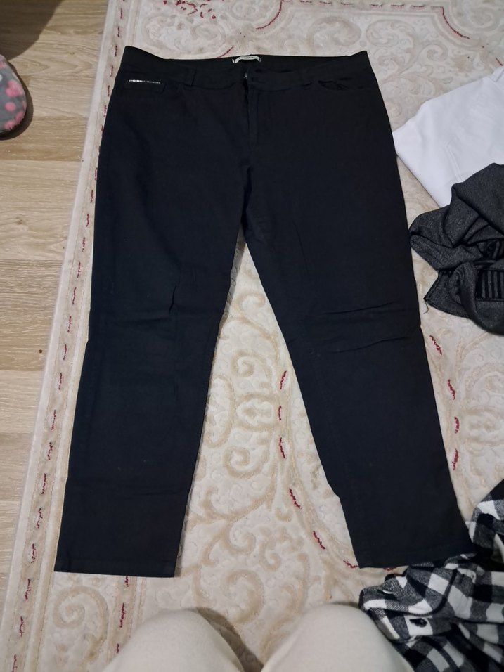 Kadın siyah kumaş pantolon, regular fit ve midi boyda, sentetik kumaştan, fermuarlı detaylara sahip, günlük rahat kullanım için uygun.