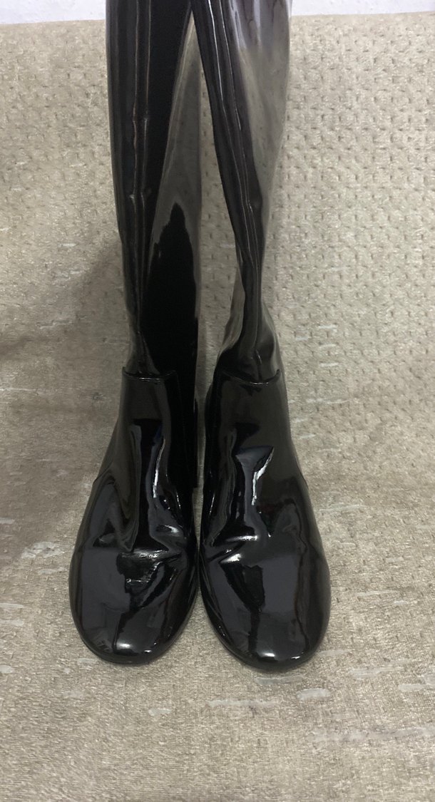 Parlak kauçuk malzemeden yapılmış siyah dizüstü çizme. İnce topuklu, tokalı ve desen içermeyen tasarımıyla günlük kullanıma uygundur.
