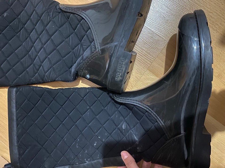 Parlak siyah kauçuk malzemeden yapılmış, dolgu topuklu ve tokalı kadın diz boyu çizme. Sokak modasına uygun, şık ve avangart tasarım.