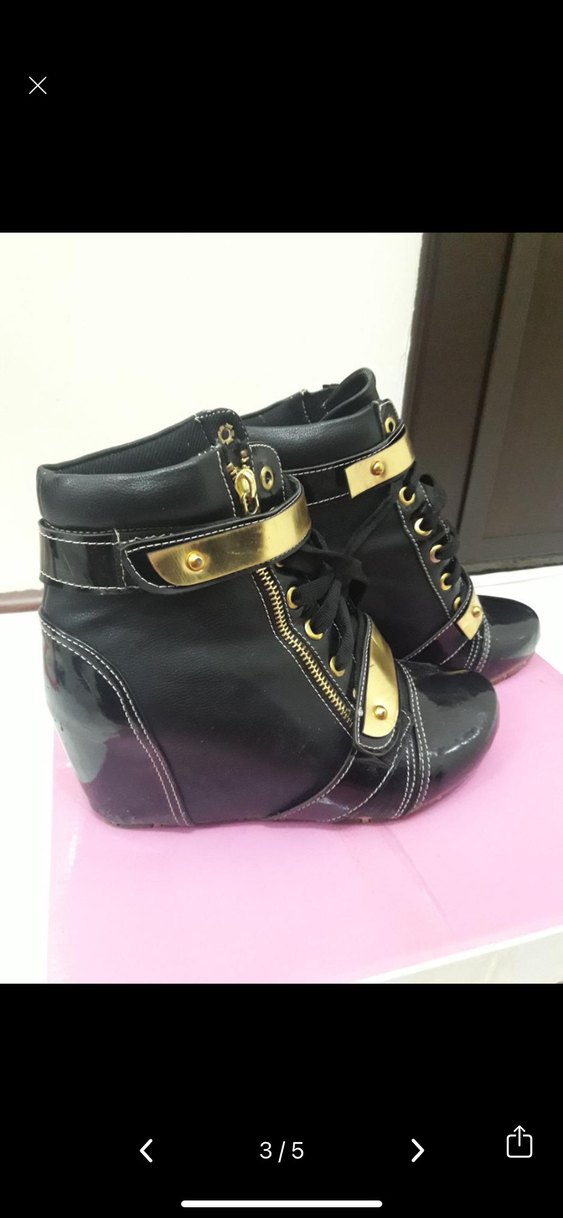 Parlak siyah rugan dolgu topuklu botlar, tokalı ve bağcıklı tasarıma sahiptir. Altın renkli detaylar ve desenli yapısıyla avant-garde goth tarzını yansıtır. Günlük kullanıma uygundur.