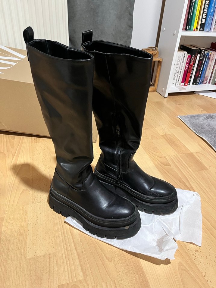 Parlak kauçuk malzemeden yapılmış, tokalı ve platform topuklu siyah dizüstü çizme, gotik sokak stili için uygundur. Çok temiz durumda Kutusu ile gönderilecektir