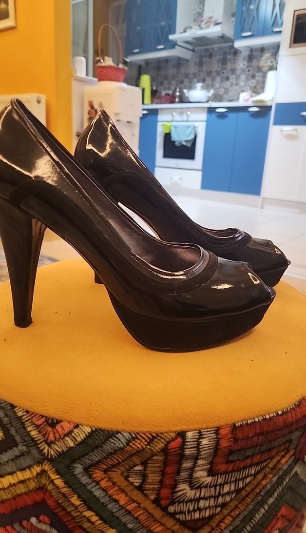 Kadınlar için siyah rugan parlak platform topuklu stiletto, cesur gotik tarzda, kauçuk tabanlı ve ofis kullanımı için uygun.