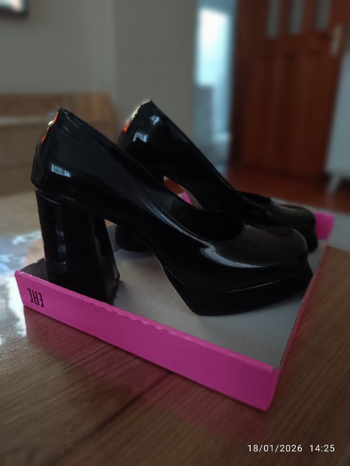 Siyah rugan parlak platform topuklu stiletto, baskılı desenli ve kauçuk malzemeden. Cesur gotik tarz, romantik akşamlar için uygun.