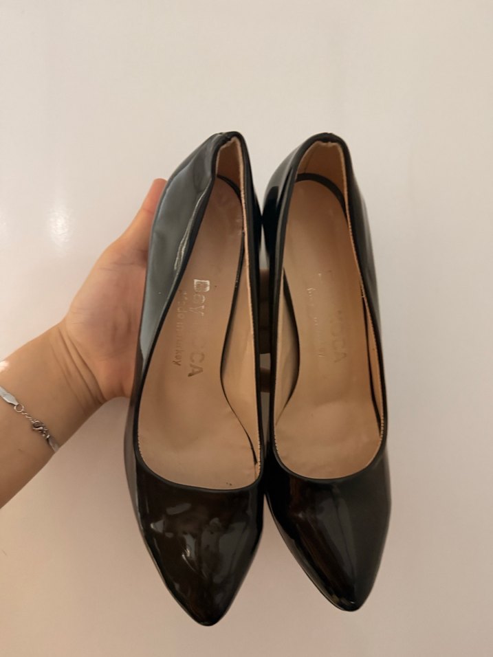 Siyah rugan görünümlü, kauçuk malzemeden yapılmış stiletto topuklu ayakkabılar. Minimalist ve gotik tarzıyla ofis kullanımı için uygundur.