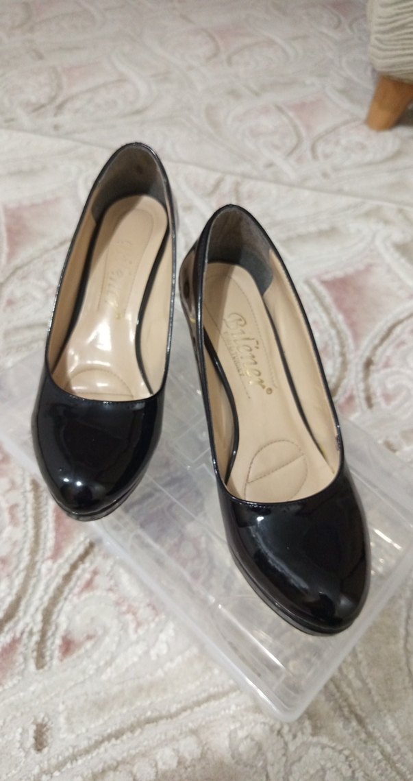 Siyah parlak rugan stiletto topuklu ayakkabılar, baskılı desenli ve kauçuk malzemeden. Klasik şıklık ve gotik stil, ofis düğün kullanımı için uygundur.