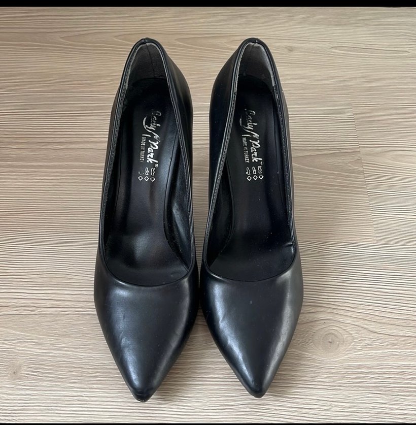 Siyah rugan stiletto topuklu ayakkabılar, sivri burunlu ve tokalı detaylıdır. Ofis kullanımı için uygundur, cesur ve klasik gotik tarzda.