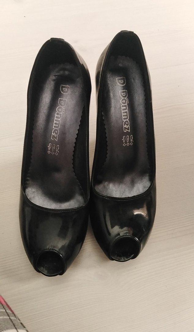 Siyah rugan stiletto topuklu, kauçuk malzemeden yapılmış cesur gotik tarzda, desen içermeyen kadın ayakkabısı. Hem gece hem ofis için uygundur.