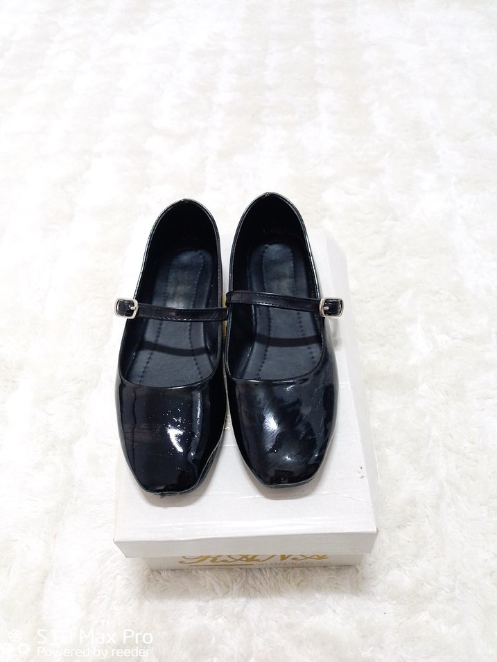 Siyah rugan görünümlü düz tabanlı, tokalı bantlı kadın ayakkabısı, minimalist gotik tarzda, günlük kullanıma uygun.Sadece 1 kere kullandım Düz tabanlı ayakkabı giyemedigim için satmak istiyorum
