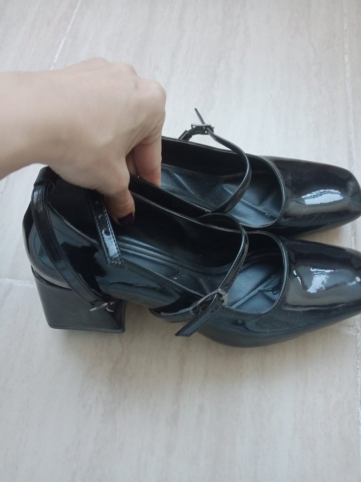 Kadınlar için siyah rugan malzemeden, tokalı kemer detaylı blok topuklu klasik ayakkabı. Gotik tarzda, desen içermeyen şık tasarım. ucunda uçak bı sorun var çekildi