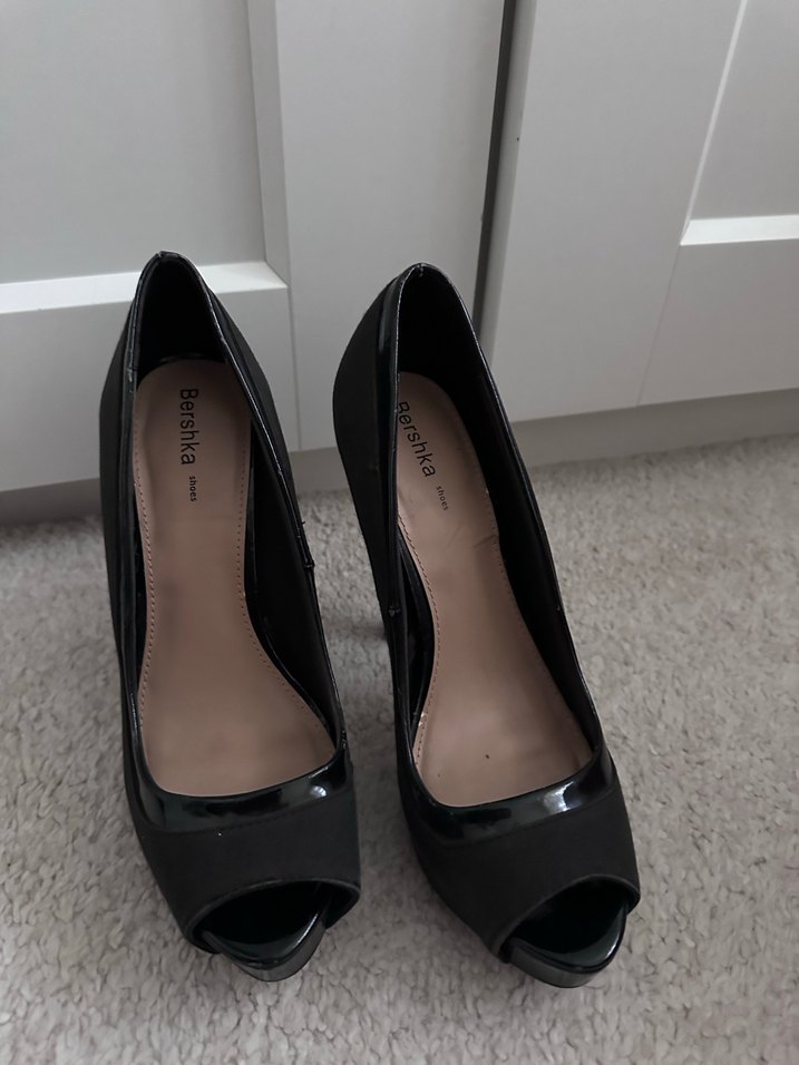 Bershka markalı siyah rugan stiletto, açık burunlu ve tokalı detaylı, romantik akşamlar için minimalist gotik tarzda.
