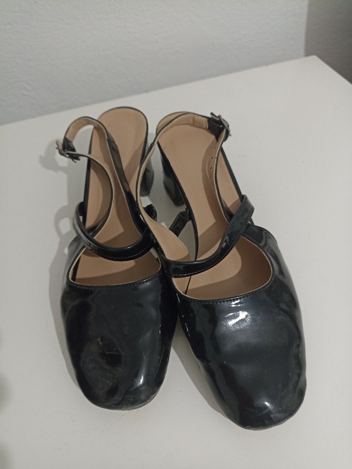Kadınlar için siyah rugan, tokalı, blok topuklu klasik ayakkabılar. Goth tarzında, günlük kullanıma uygun, desensiz tasarım.