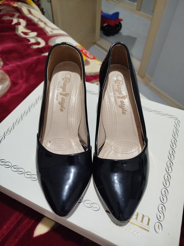 Siyah rugan görünümlü, baskılı desenli, kauçuk malzemeden yüksek topuklu stiletto. Klasik ve şık tarzda, günlük kullanım için uygun.